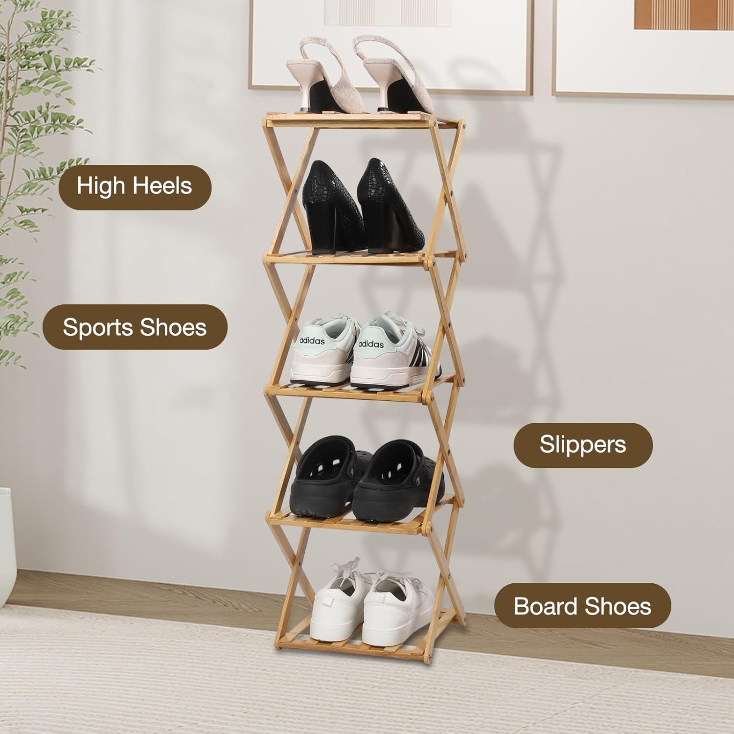 - Smart Vertical Storage System: The 5-tier bamboo shoe rack maximizes vertical space, accommodating various types of footwear, including shoes, boots, and high heels, ensuring your shoes are neatly organized and minimizing clutter. Specifically designed for entryways or closets, it has a small footprint and can be placed against the wall to save space.