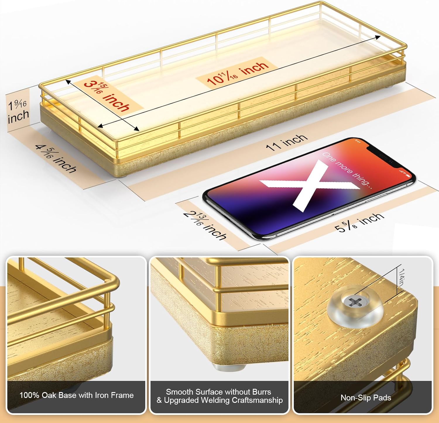 Bathroom Tray for Counter, Oak Wooden 11.2" L Decorative Vanity Tray for Dresser Tops, Kitchen Countertop Organizer, Gold Brushing