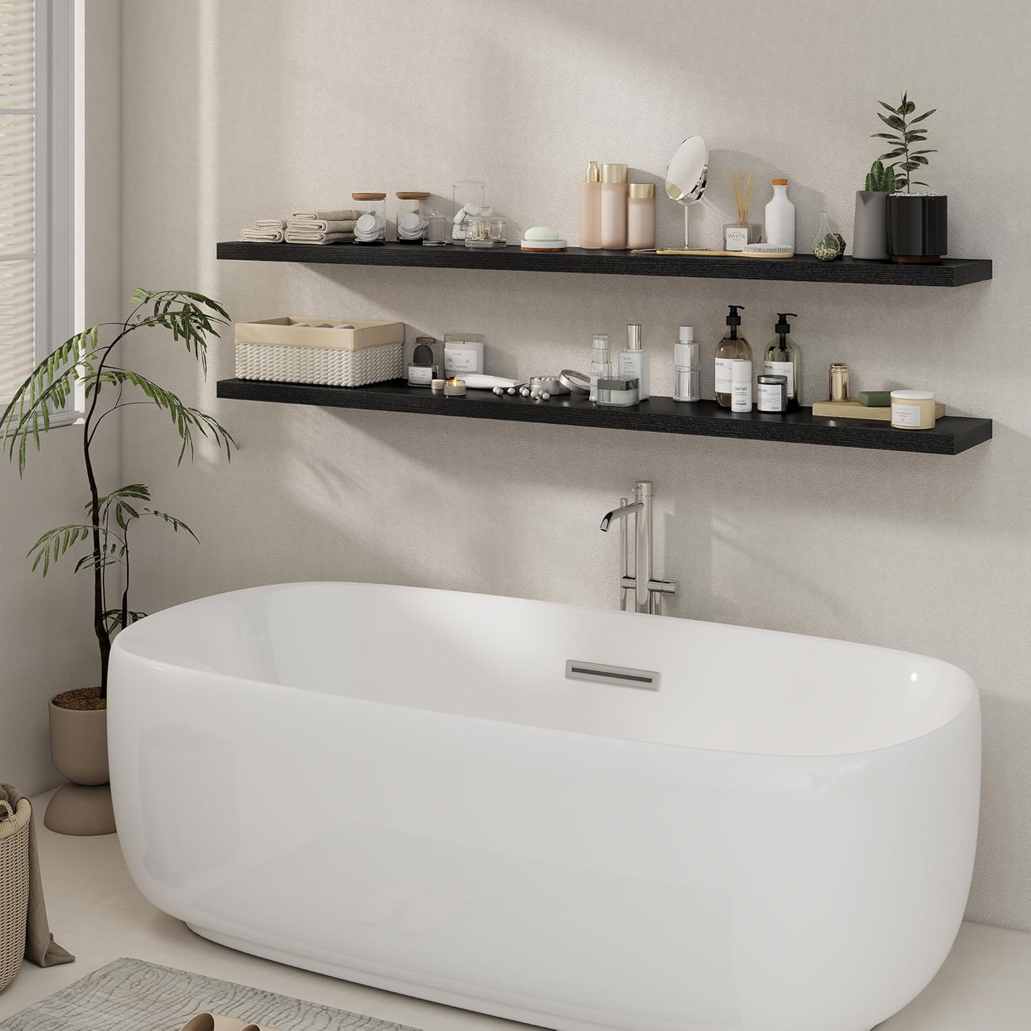 - ăDECORATIVE & FUNCTIONALăThe wall-mounted floating shelves are designed for decoration and storage, utilizing and decorating any space in your home. Used as shelf decor to show your collection, books, or prize, the hanging shelves are perfect for displaying your photo frame, small plants, model, or audio in your living room, office, study. And can also use as over the toilet storage shelf in the bathroom to hold toiletries or used as kitchen shelf to storage condiments.