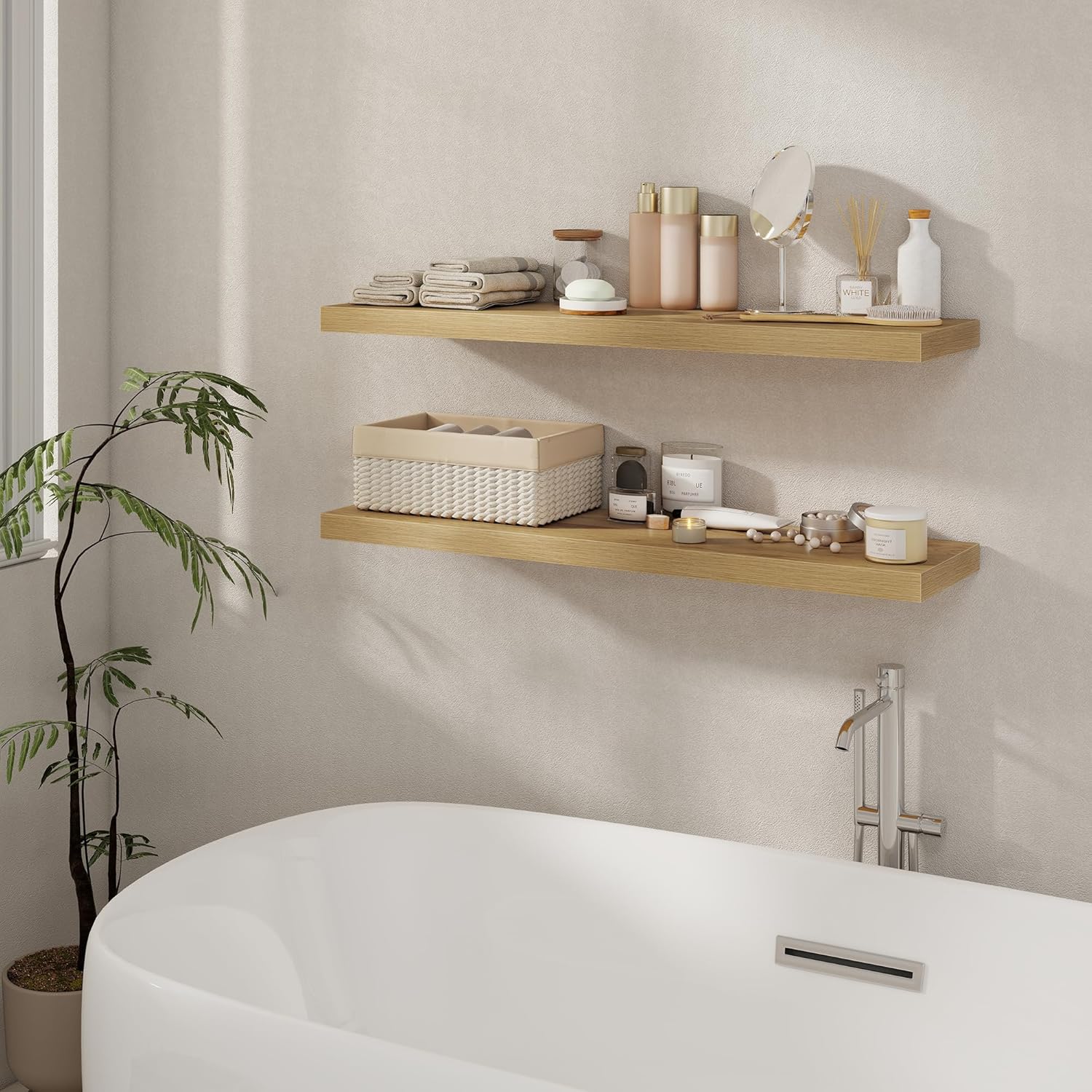 - ăDECORATIVE & FUNCTIONALăThe wall-mounted floating shelves are designed for decoration and storage, utilizing and decorating any space in your home. Used as shelf decor to show your collection, books, or prize, the hanging shelves are perfect for displaying your photo frame, small plants, model, or audio in your living room, office, study. And can also use as over the toilet storage shelf in the bathroom to hold toiletries or used as kitchen shelf to storage condiments.