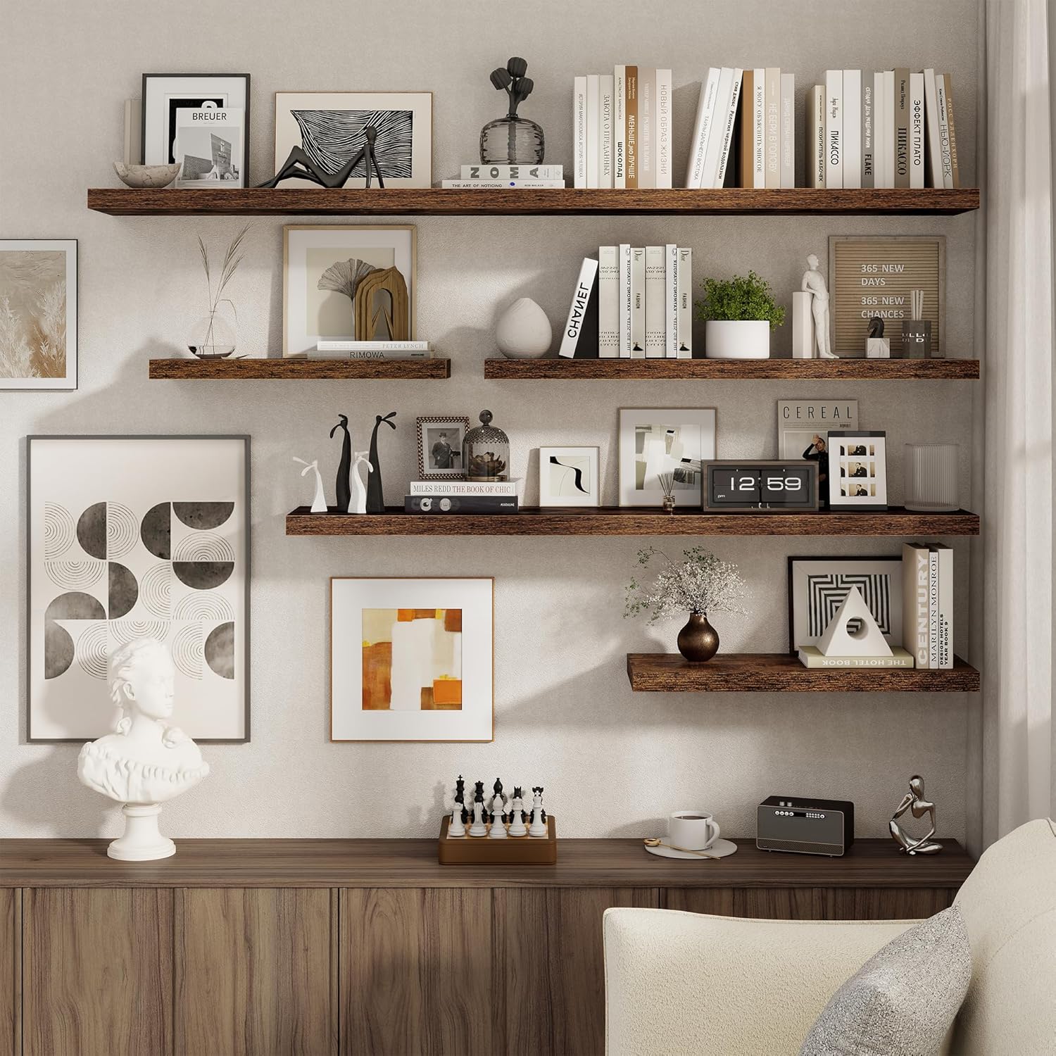 - ăDECORATIVE & FUNCTIONALăThe wall-mounted floating shelves are designed for decoration and storage, utilizing and decorating any space in your home. Used as shelf decor to show your collection, books, or prize, the hanging shelves are perfect for displaying your photo frame, small plants, model, or audio in your living room, office, study. And can also use as over the toilet storage shelf in the bathroom to hold toiletries or used as kitchen shelf to storage condiments.