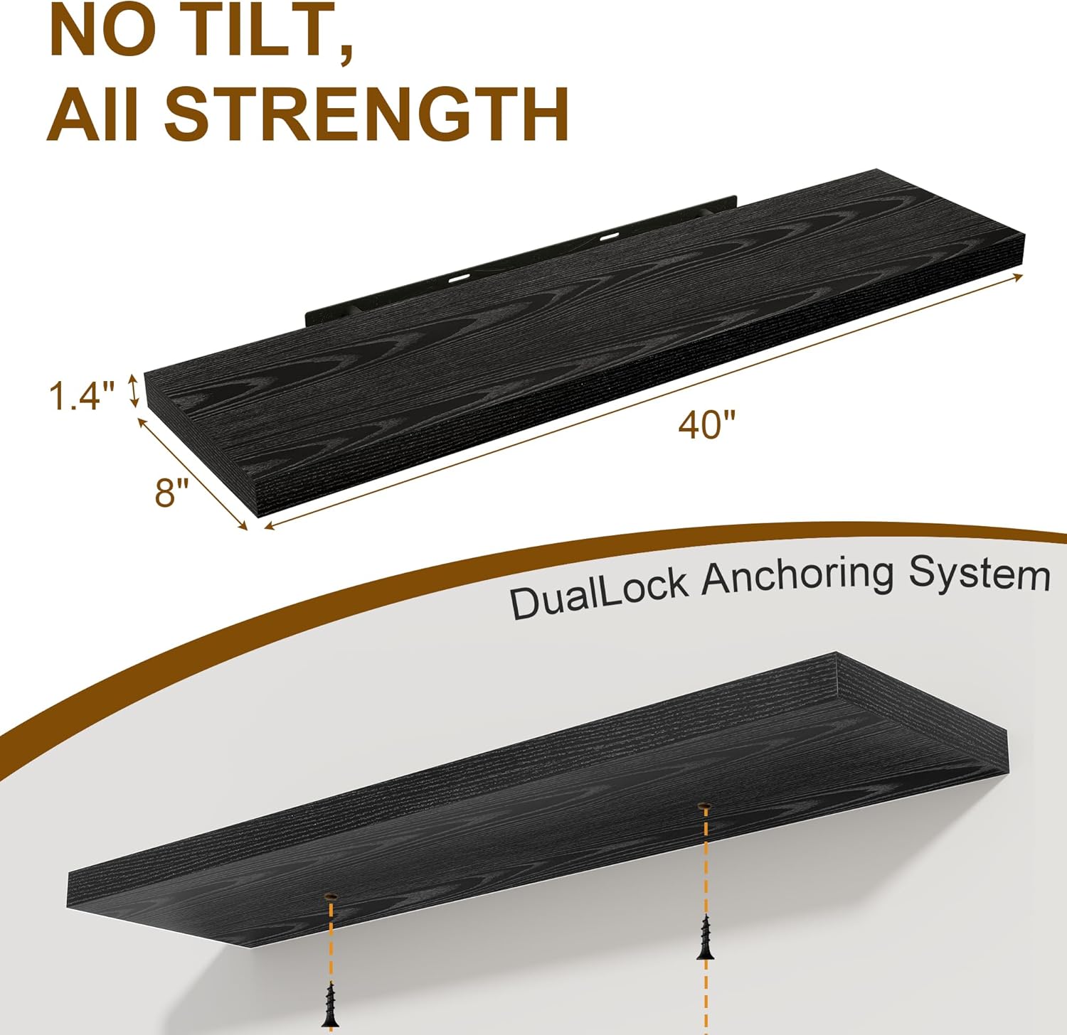 Fun Memories 40 Inch Floating Shelves Set of 2, 8 Inch Deep Wall Shelf, Rustic Wood Storage Shelves for Bedroom, Kitchen, Bathroom, Wall-Mounted Shelf with Invisible Brackets for Books|Storage Black