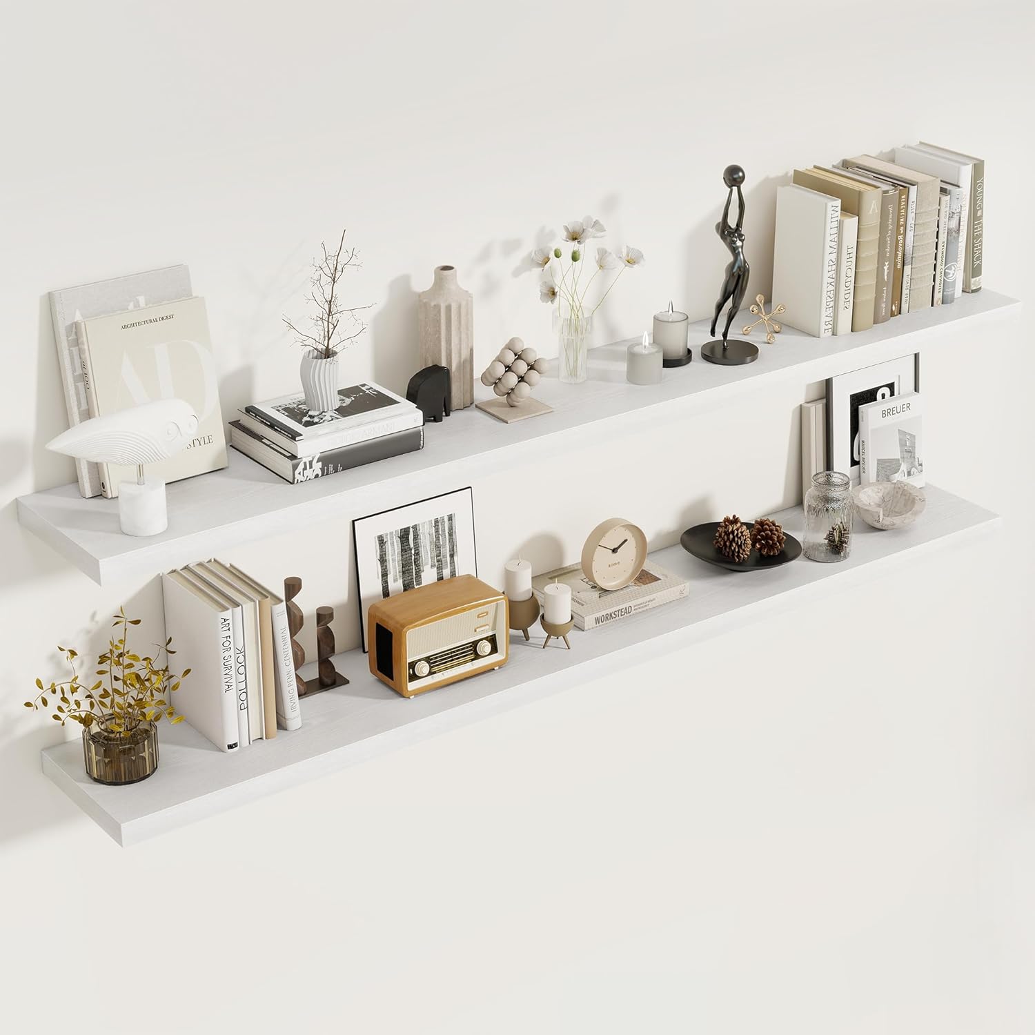 72 Inch Floating Shelves 2 Pack, 8 Inch Deep Floating Shelf Wall Mounted, Large Shelves with Invisible Bracket for Books|Storage, Rustic Wood Wall Shelf for Bedroom, Kitchen, Living Room, White
