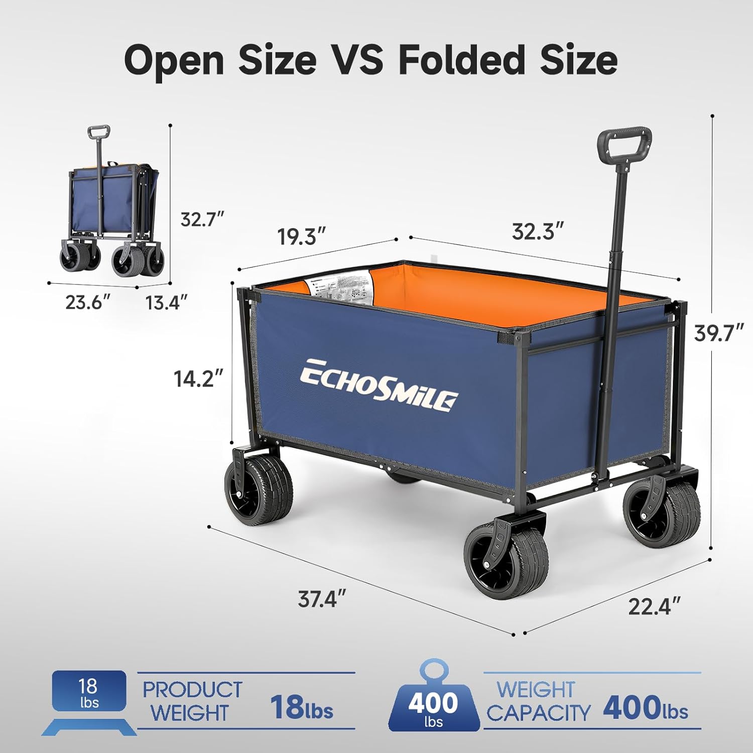 EchoSmile Collapsible Wagon Cart for Camping & Beach - Heavy Duty 400lbs Capacity All-Terrain Cart with Wide Wheels, Portable Folding Utility Wagon for Grocery, Garden, Sports,Blue&Orange