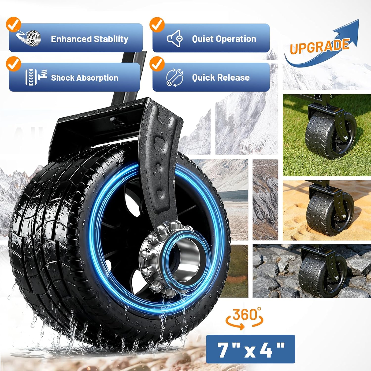 - 【All-Terrain Wide Wheels】Tackle beach, camping, and rough paths effortlessly. Features massive 9cm wide wheels and 360° swivel front wheels for superior stability on any surface. Your ultimate beach wagon and off-road cart.
