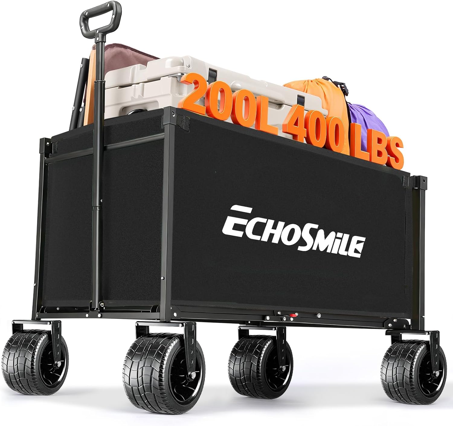 EchoSmile Collapsible Wagon Cart for Camping & Beach - Heavy Duty 400lbs Capacity All-Terrain Cart with Wide Wheels, Portable Folding Utility Wagon for Grocery, Garden, Sports,Black