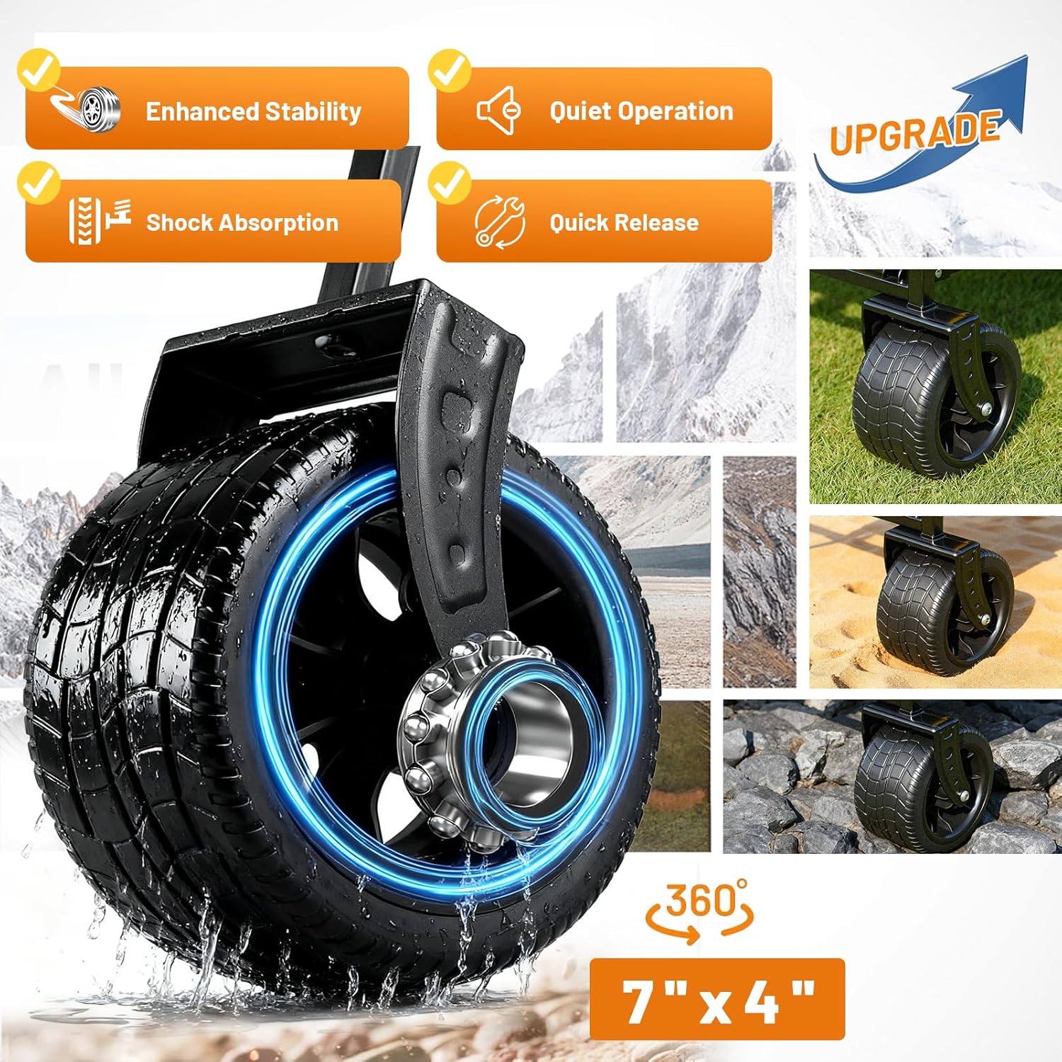 - 【All-Terrain Wide Wheels】Tackle beach, camping, and rough paths effortlessly. Features massive 9cm wide wheels and 360° swivel front wheels for superior stability on any surface. Your ultimate beach wagon and off-road cart.