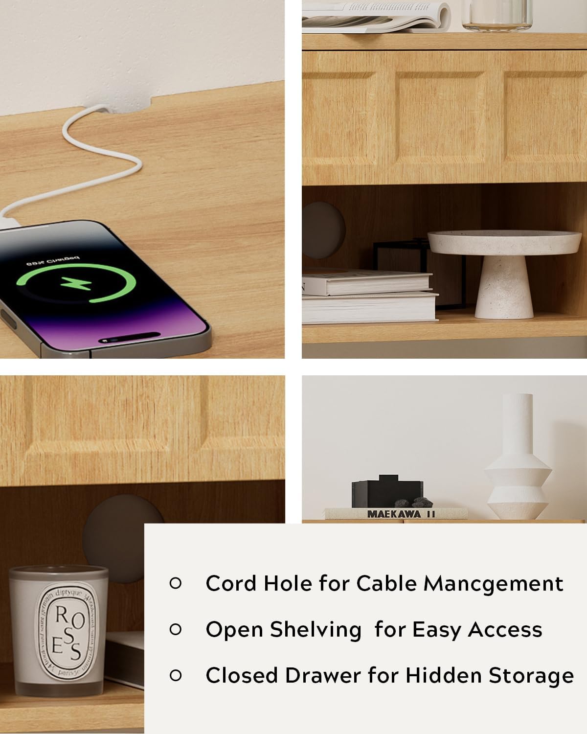 - Thoughtful Design: This wall-mounted night stand's cord hole simplify cable management, while the enclosed drawer and open compartment provide the suitable storage space for your bedside items. With its solid wall-mounted design, the sturdy construction brings you greater weight support