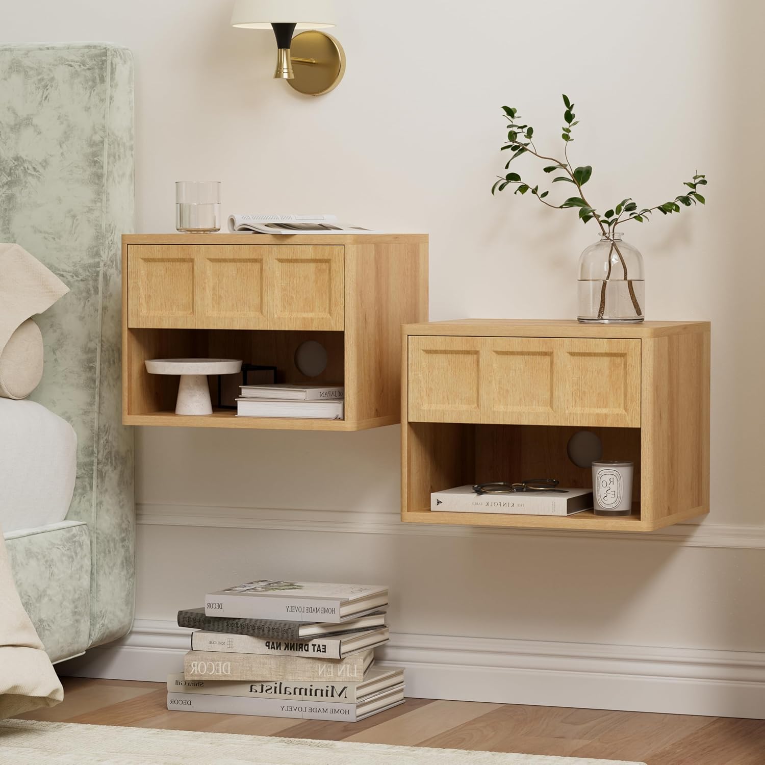 Farmhouse Floating nightstands Set of 4, Small Wall Mounted Storage Cabinet with Drawer Open Shelf, Wood Bedside End Table for Bedroom, Living Room, Natural Oak