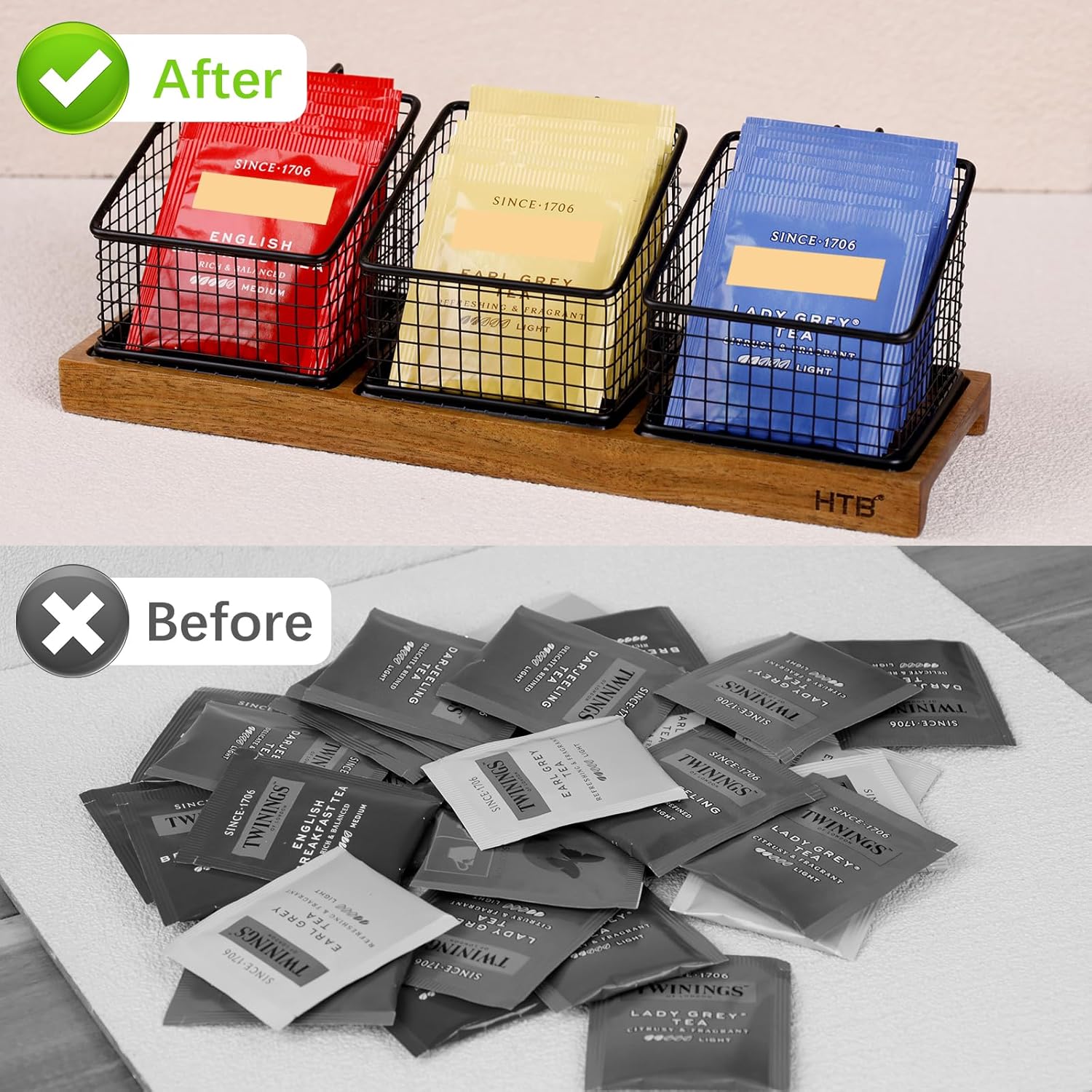 HTB Tea Organizer for Tea Bags, Tea Bag Holder with Acacia Wood Stand and 3 Removable Metal Basket for Sugar Packets, Sweeteners, Creamers for Cabinet, Countertop