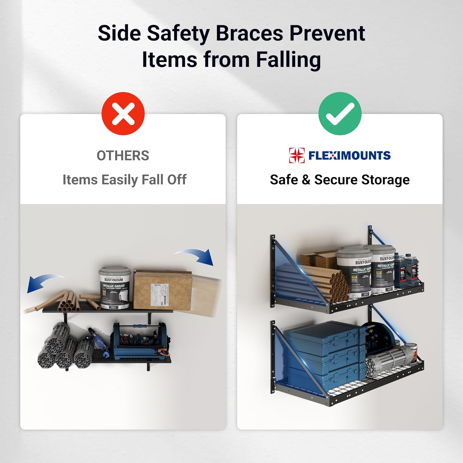 FLEXIMOUNTS 2-Pack 2x4ft Garage Wall Shelving with 4 Hooks - Heavy Duty Garage Storage System, 660 lbs Load Capacity with Brace Guardrail, Wall Mounted Organization for Bikes, Tools, Bins, Pro Series