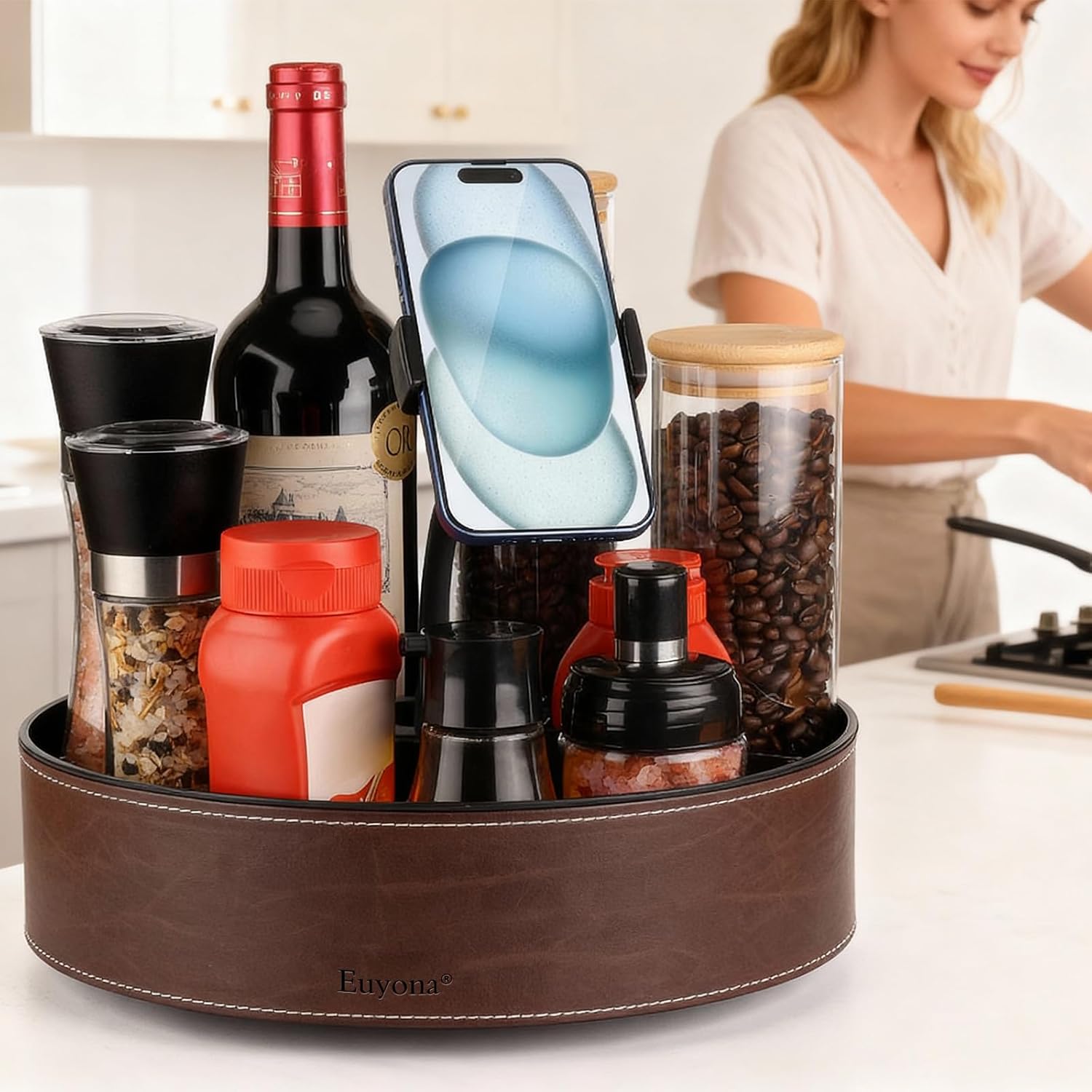- Adjustable Phone Holder:Multitask effortlessly with this innovative lazy susan featuring a fully adjustable phone stand. Perfect for following recipes in the kitchen, watching tutorials at your vanity, or browsing content in the office. The rotating desk organizer keeps devices securely positioned at your preferred viewing angle while maximizing workspace efficiency.