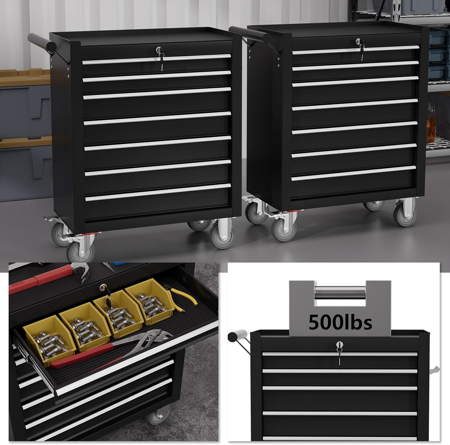 - Spacious 7-Drawer Design: The tool chest have 7 drawers to keep our tools.Our rolling tool cart offers ample storage space for organizing tools, accessories, and equipment, ensuring easy access and efficient organization.