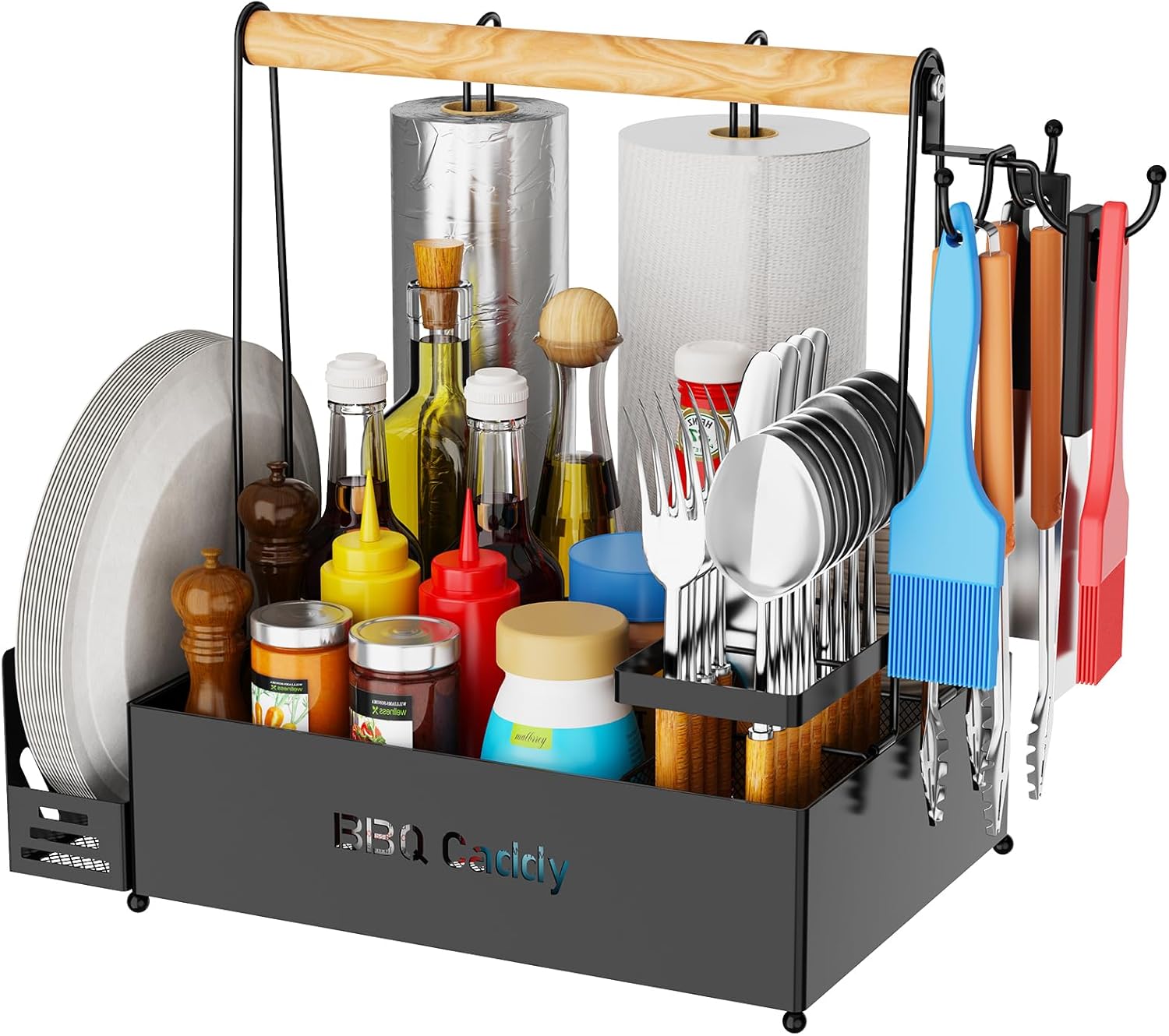 - ăIdeal Condiment CaddyăBBQ caddy of 3 compartments with 2 paper towel roll holders, 3 hooks, and a removable napkin holder. The logical partition design makes it easier to store forks, spoons, knives, plates, napkins, condiments, grill tools, and other supplies, ideal for a cutlery caddy
