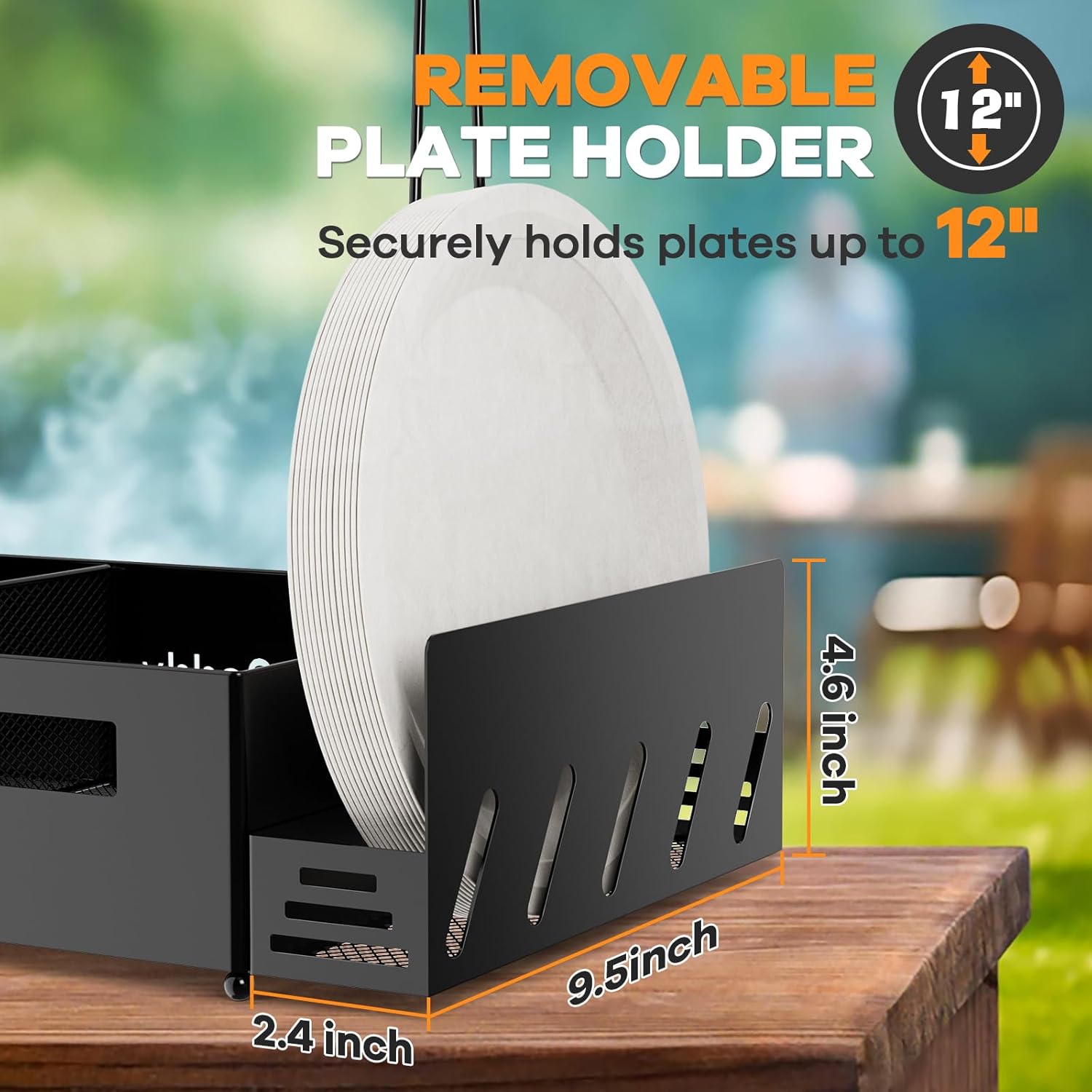 - ăHeavy DutyăMade with powder-coated steel to ensure its durability and ability to withstand various climates and uses. Its rust-resistant properties make it perfect for outdoor activities. The large capacity size is 14''x9.5''x13.6' with a removable dish. Whether you're using it for cleaning supplies, BBQ accessories, camper accessories for travel trailers, or as an outdoor organizer, the Grill Caddy is a reliable and long-lasting choice
