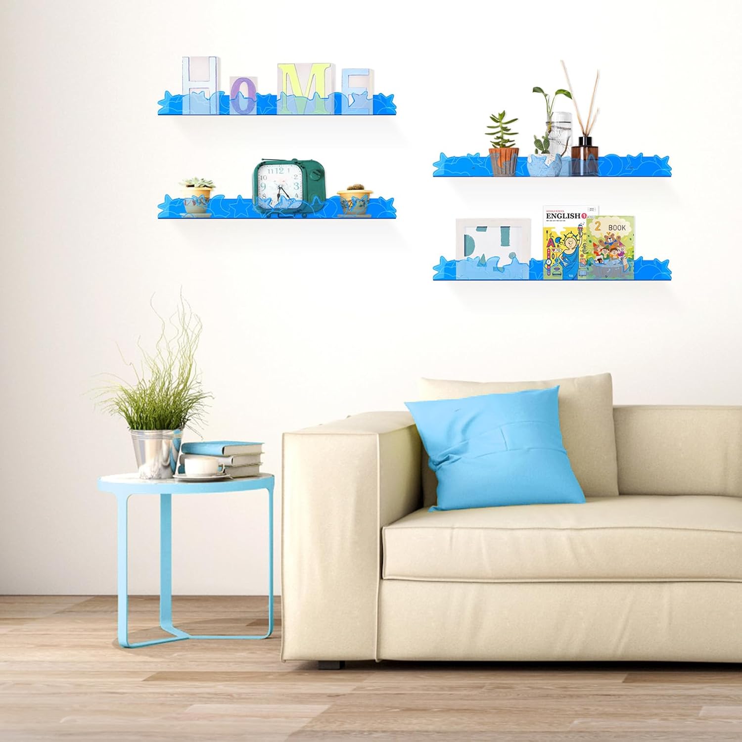 Floating Shelves for Wall,4 Pack 15.7’’x 3.5’’Adhesive Acrylic Shelves Organizer for Book Toy Photo Makeup,Wall-Mounted Kids Storage for Bathroom,Bedroom,Nursery,Blue Star and Moon
