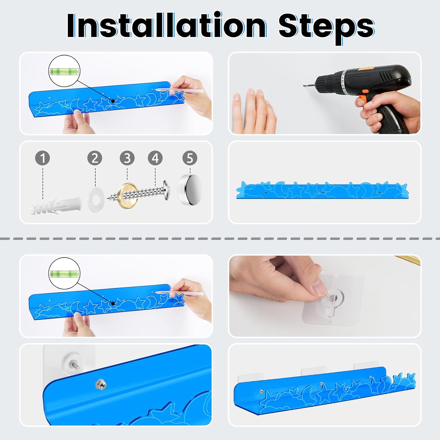 - Space-Saving: This set of 4 blue star-moon acrylic wall-mounted shelves creates multi-layered storage space while maintaining wall aesthetics. It "moves" small items like books, toys, cosmetics, and photos onto the wall, freeing up tabletop and countertop space to keep the room tidy and organized at all times.