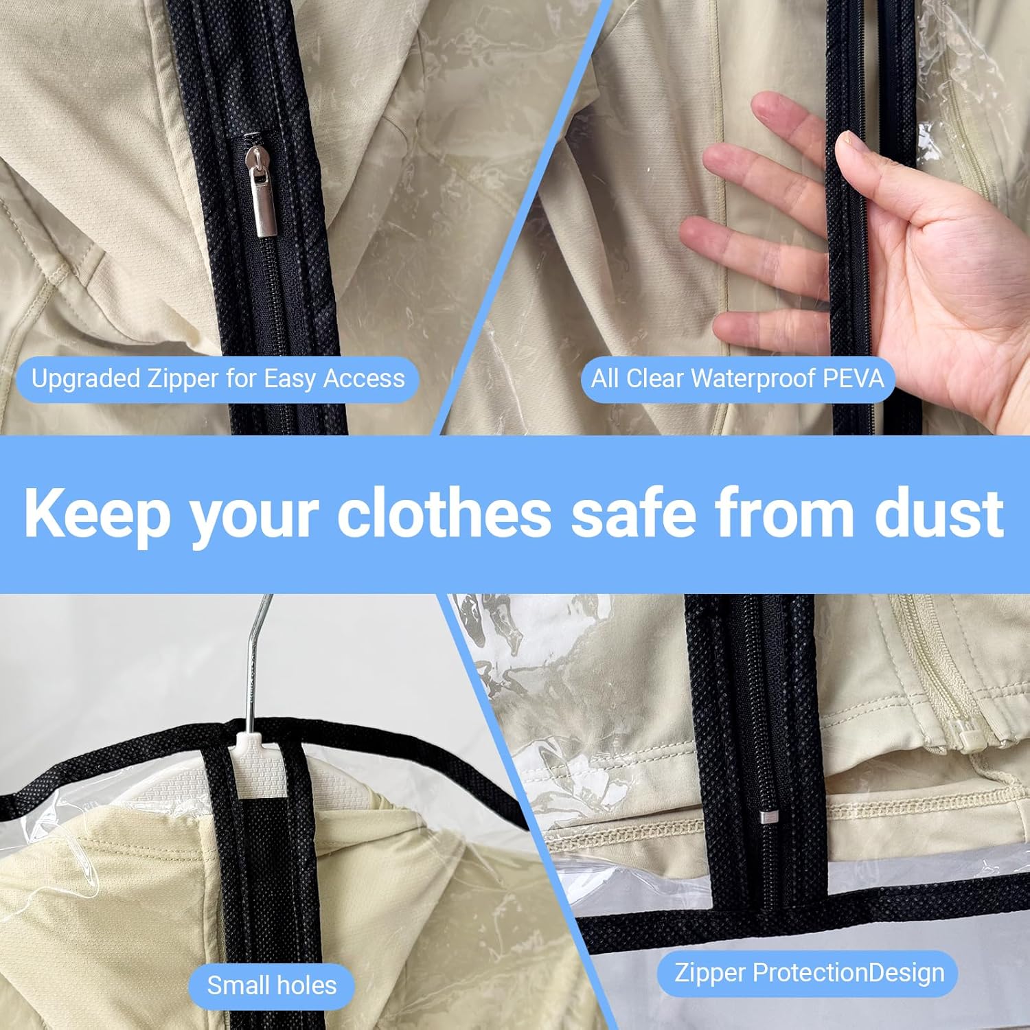 - 【60" Length & Set of 12】– Measuring 60" x 24", this clothes cover for hanging can store most short tops such as suits, sweaters, winter coats, leather jackets or seasonal clothes. Plastic garment bags for hanging clothes, It's perfect for all your storage and travel needs. Translucent zipper design, Clothes can be easily seen and taken out from the cover.