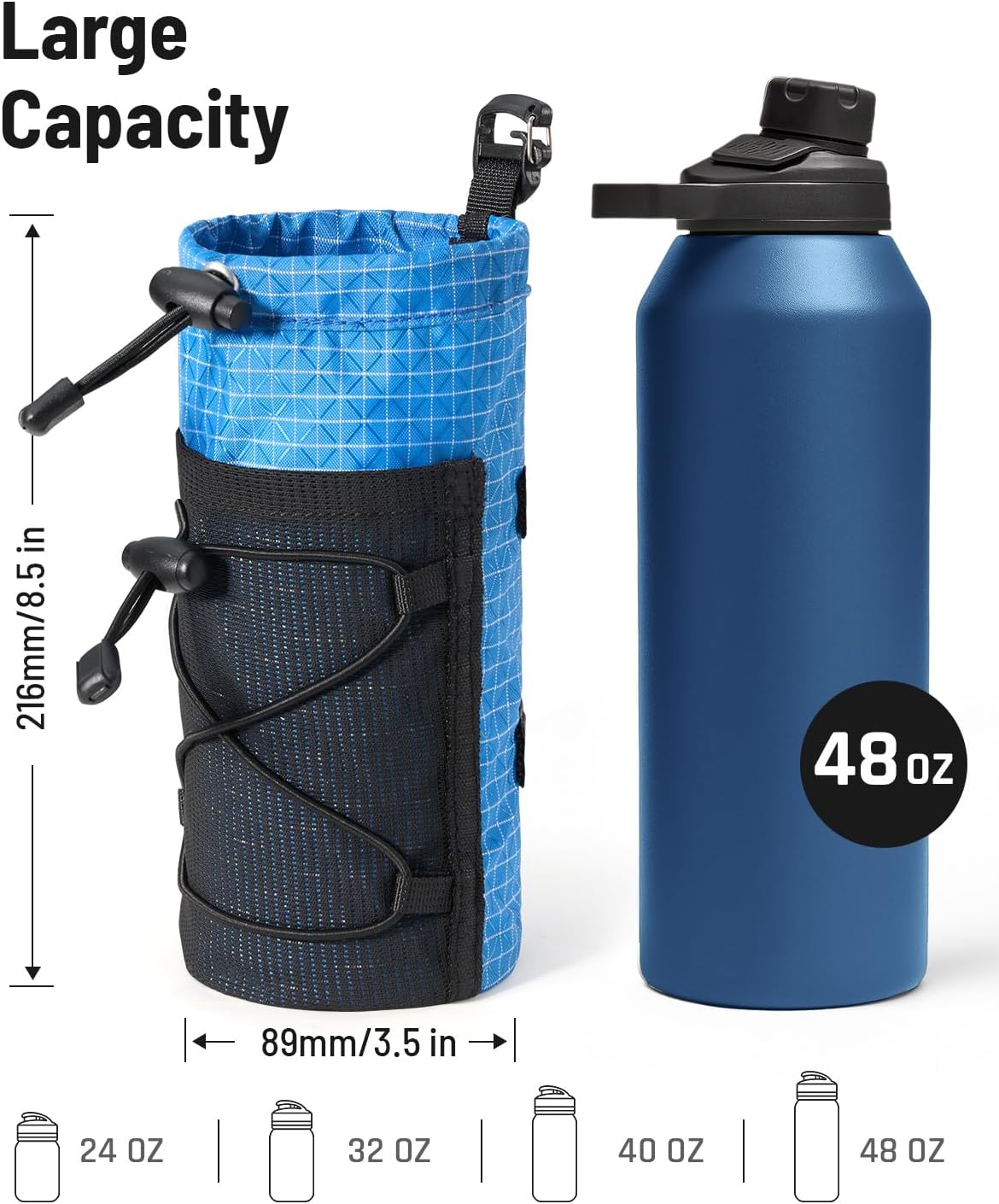 - Large Capacity: This large water bottle holder for backpack has a height of 8.5 inches and a bottom diameter of 3.5 inches. It can hold up to 48oz cups and is very durable