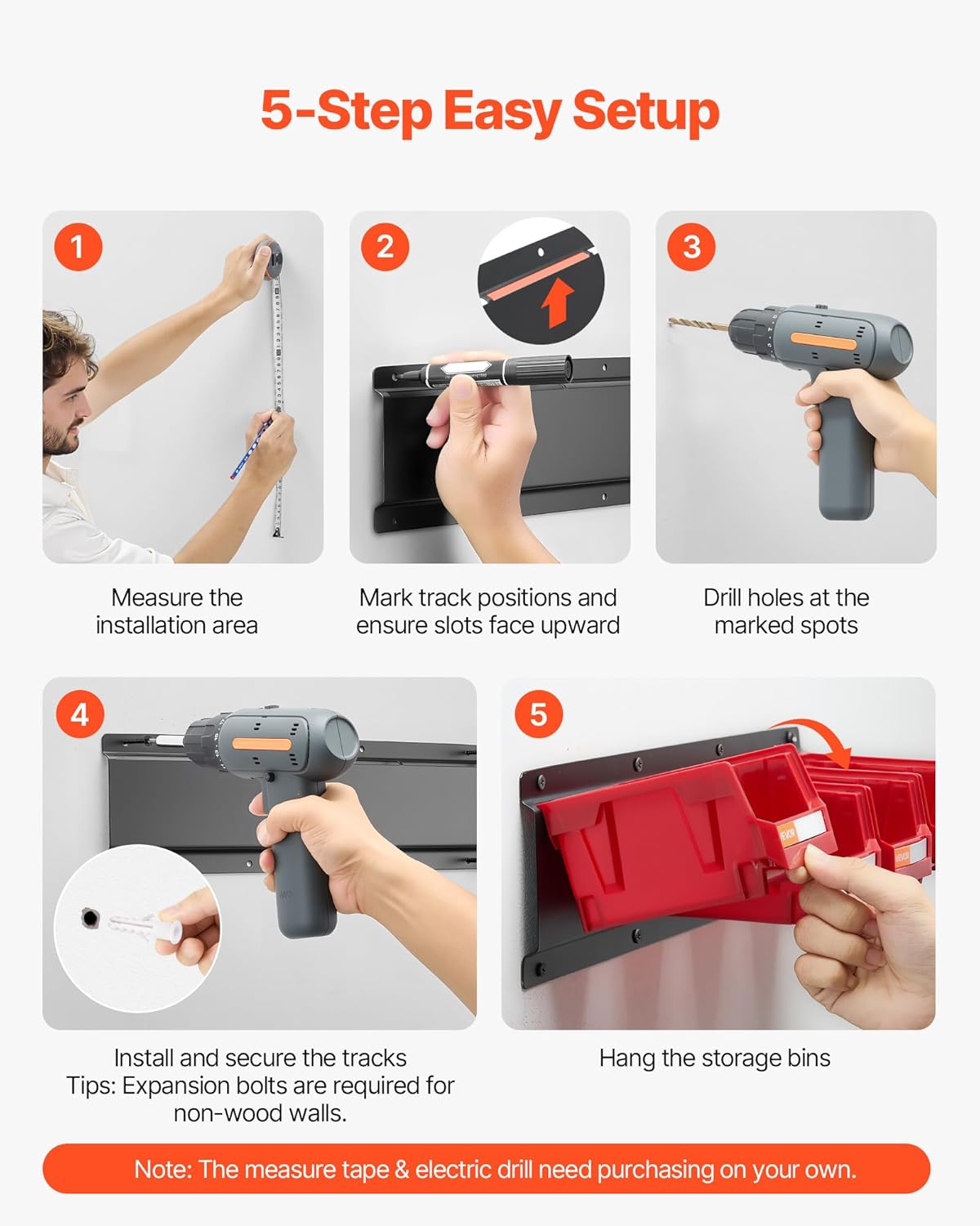 VEVOR Wall Mounted Storage Bins, 12 Plastic Bins & 3 Metal Rails, Plastic Hanging Stackable Storage Bin for Screws, Nuts, Bolts, Nails, Hardware Tool Organizer for Workshop, Craft Room, Garage, Red
