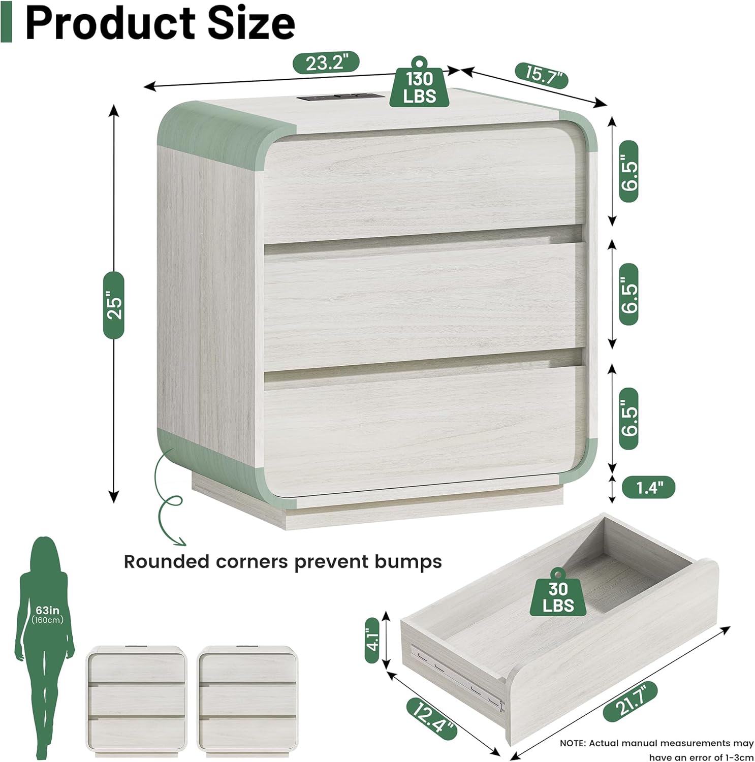 - Enhanced Safety & Stability: Our curved nightstand features four smoothly rounded corners with an anti-collision design, making it safer for families with children or seniors. Three-section thickened buffer rails ensure drawers glide quietly while preventing slips. The 1.4" reinforced base provides extra stability and load-bearing capacity, keeping this versatile nightstand, bedside table, end table, or side table safe, sturdy, and reliable for daily use
