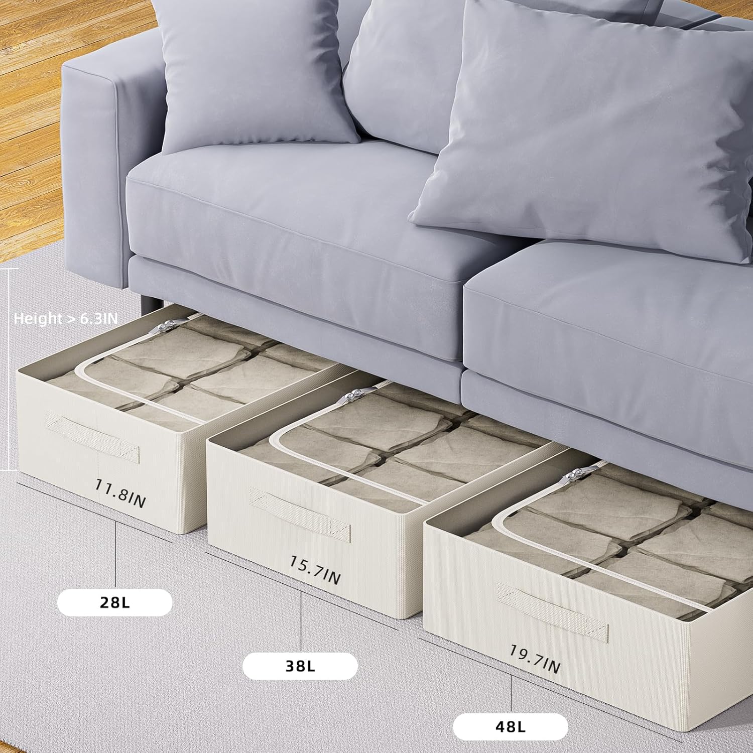 - LARGE CAPACITY STORAGE BOX: 2pcs Large storage space for storing a variety of things. 6.3" tall, fits beds 6.5" off the floor and higher. The Frame Storage Bags has 3 handles make it easy and convenient for you to carry and pull out from under the bed.