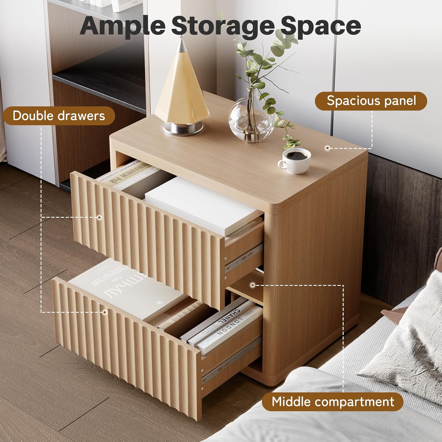 Dripex Fluted Nightstand with 2 Drawers, Large Wide Wood Night Stand Bedside Table for Bedroom, Mid-Century Modern Storage Bed Side Table, End Table for Living Room Sofa Couch, Natural Oak