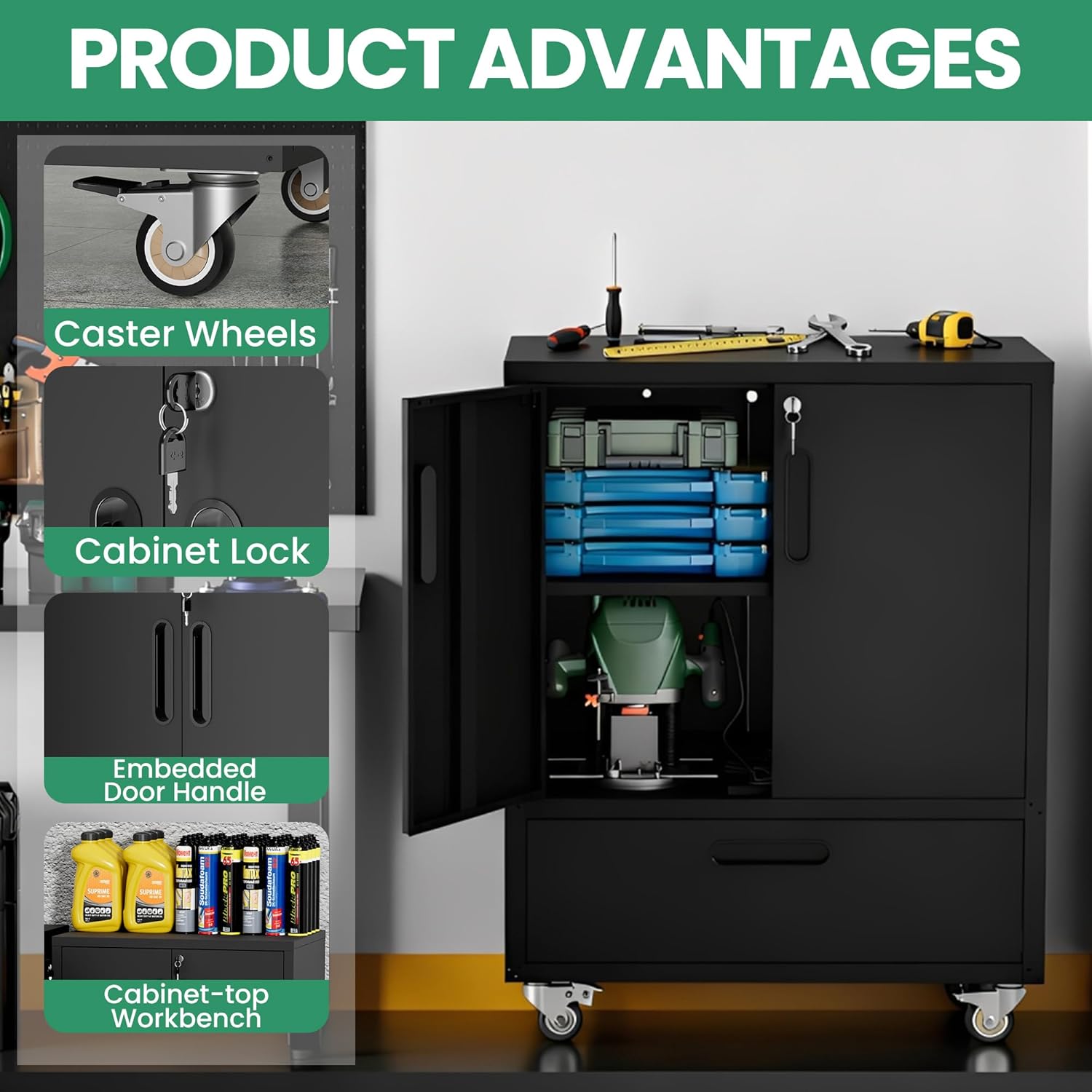 - Secure Storage with Locking Doors & Drawer. Keep your valuables safe with the VIYET garage storage cabinet with drawers. The lockable doors come with two keys, preventing unauthorized access. Added wall-anchor holes allow you to secure the cabinet in place. Ideal for families and shared spaces, this tool cabinet on wheels protects your gear from kids and theft, giving you total peace of mind while storing everything from power tools to chemicals.