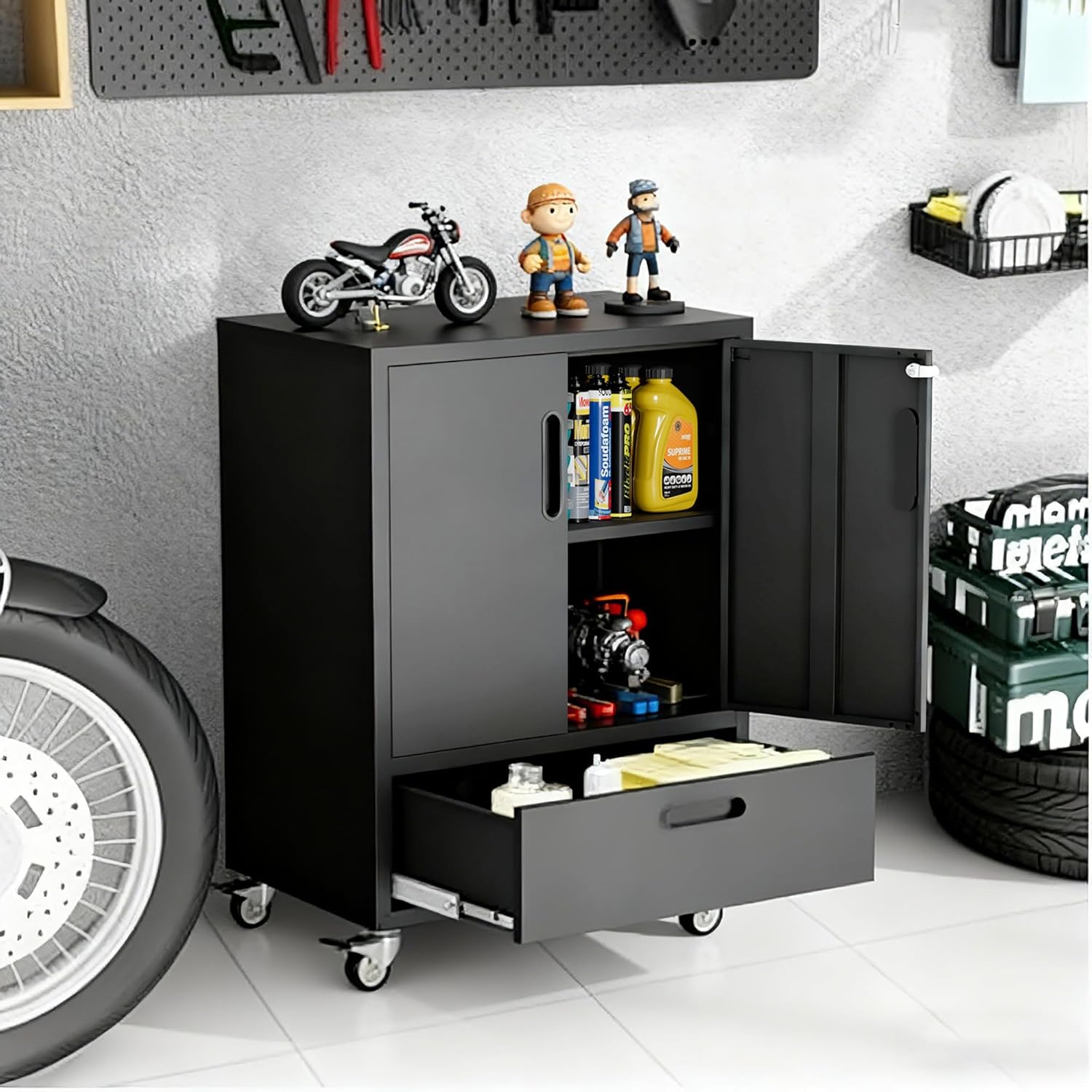 - Transform Your Cluttered Garage into an Organized Pro Workshop. Meet the VIYET Metal Tool Cabinet β your ultimate storage solution for tools, auto parts, and DIY supplies. With an upper double-door compartment featuring an adjustable shelf and a lower smooth-gliding drawer, this heavy duty rolling metal cabinet keeps everything in place. Made with reinforced panels and a sleek matte black finish, it fits perfectly in any garage or workshop. Total weight capacity: 500 lbs. Finally, a clutter-free space where creativity and productivity thrive!