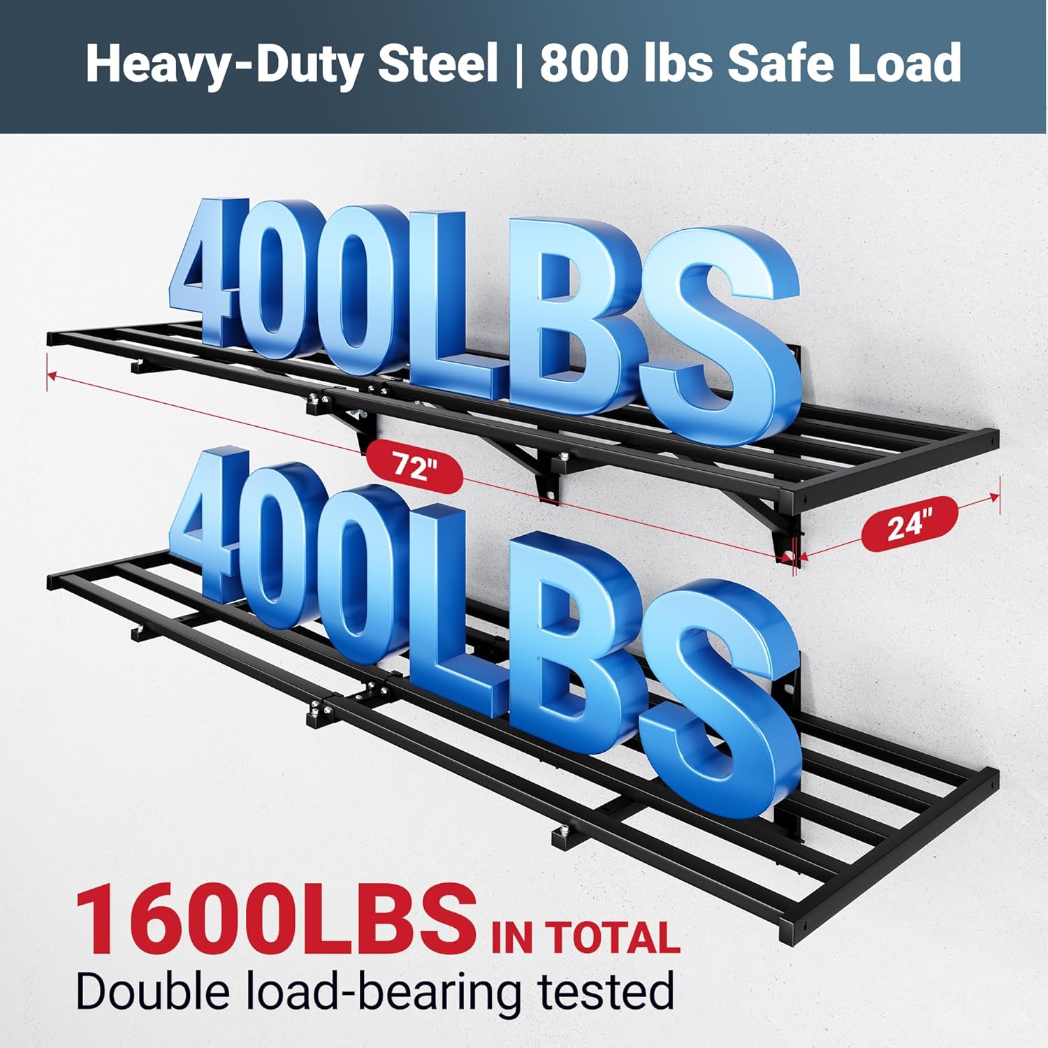 - 1600 lbs Tested, 800 lbs Total Rated Capacity: Double-tested for safety, each reinforced steel shelf in this garage wall shelving system supports up to 400 lbs, providing rock-solid stability for tools, storage bins, garden supplies, sports gear, cleaning items, and heavy equipment