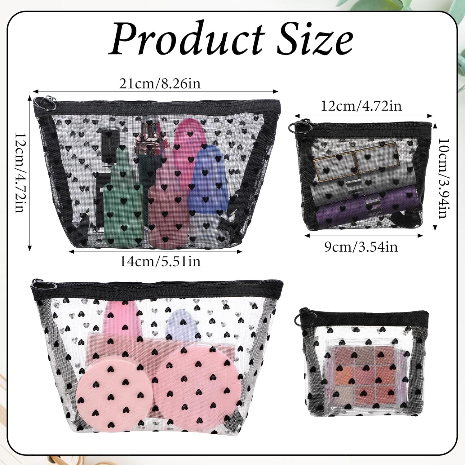 - 【Compact & Stylish】This small makeup bag for purse features a charming heart print design, adding a touch of elegance to your accessories. It comes in two sizes, one each in black and white: small (9 x 10 x 12cm) and medium (14 x 12 x 21cm). Its compact size ensures it easily fits into your handbag or suitcase.