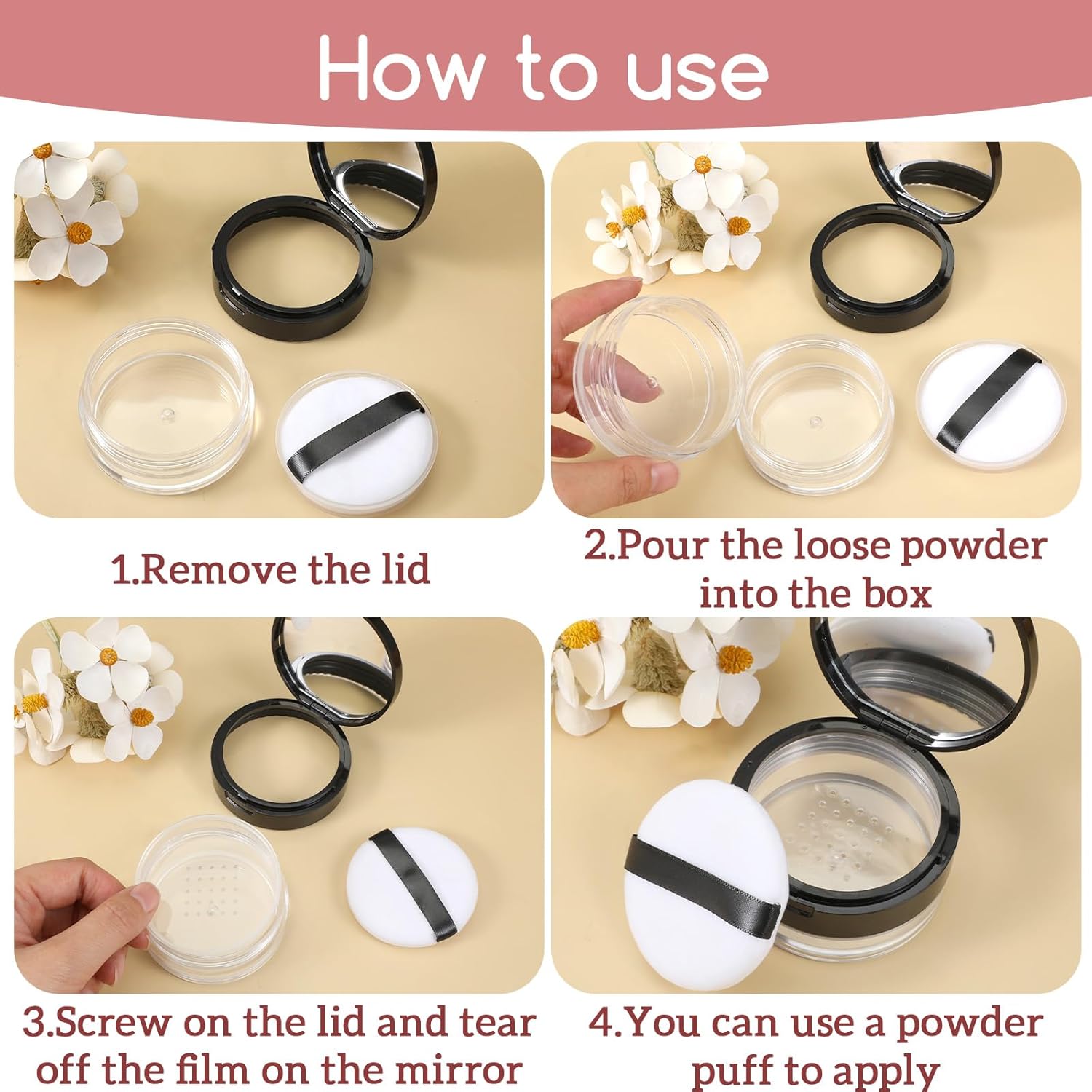 - Package Contents: You will receive 1 reusable black plastic loose powder case with a capacity of 20 grams. It measures approximately 2.75 inches long and 1.45 inches high, and includes a built-in mirror, a sponge puff, and a flexible mesh strainer