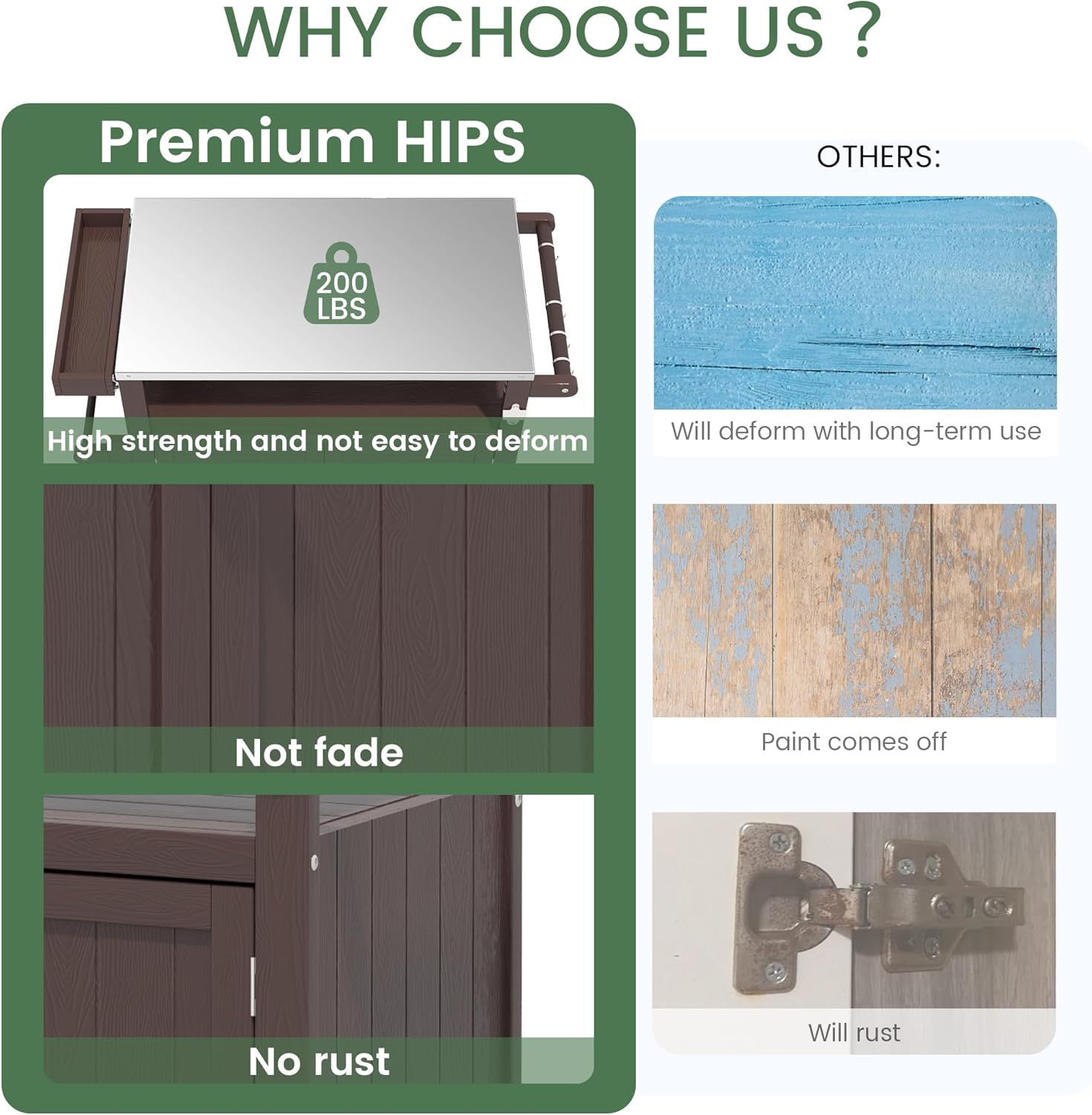 - 【All-Weather Outdoor Cart】Our outdoor kitchen island is made of HIPS poly material, which has high weatherproof and UV resistance and will not fade in all kinds of weather, including scorching sun, rain, heavy snow.